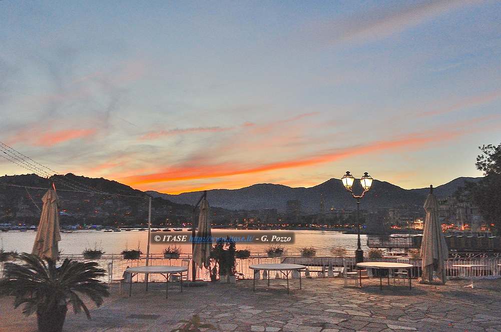 La serata scorre piacevolmente, il sole sta lasciando gradualmente il cielo ed il crepuscolo dipinge un tappeto rosso sopra la città di Rapallo.