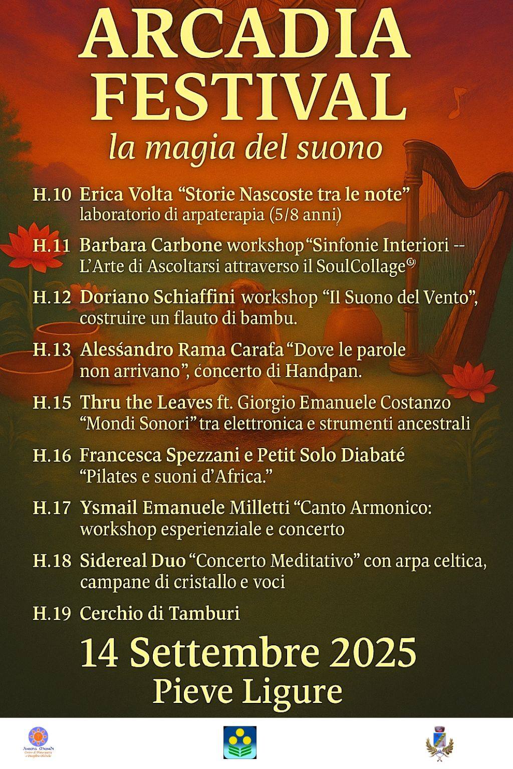 14 Settembre 2025 Inizia l'Ottobre con l'ARCADIA FESTIVAL, nella parte alta di Pieve Ligure arriva la magia del suono a partire dalle 10 del mattino. In Piazza San Michele, antistante l'omonima chiesa, la domenica dei pievesi sarà avvolta da suoni, concerti meditativi, laboratori e mercatini a tema, operatori olistici ... Vista l'alta scarsità di posti auto nella zona dell'evento il Comune di Pieve Ligure ha organizzato un servizio navetta. Di solito parte dalla Via Aurelia vicino alla stazione dei treni. Sperando nella clemenza del meteo riporto qui sotto il programma dell'evento. Per il momento una fotografia casuale. Aggiornare la pagina per vedere se sono stati aggiunti contenuti.